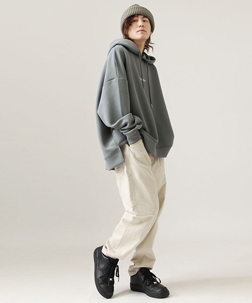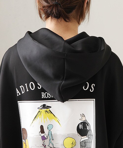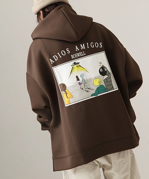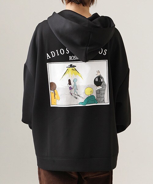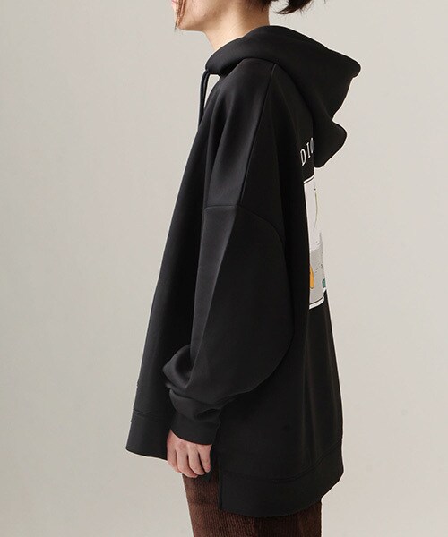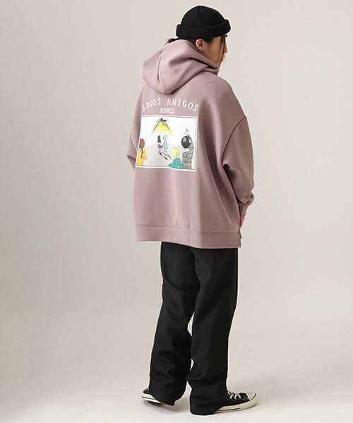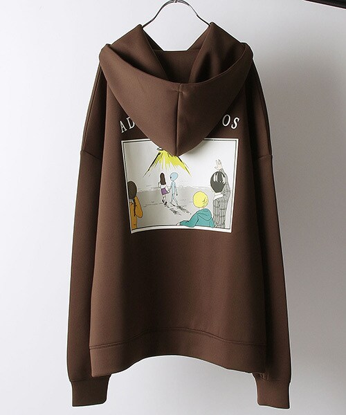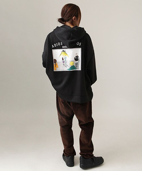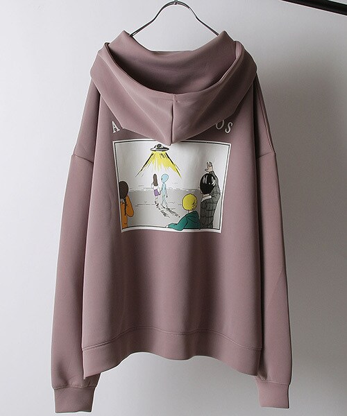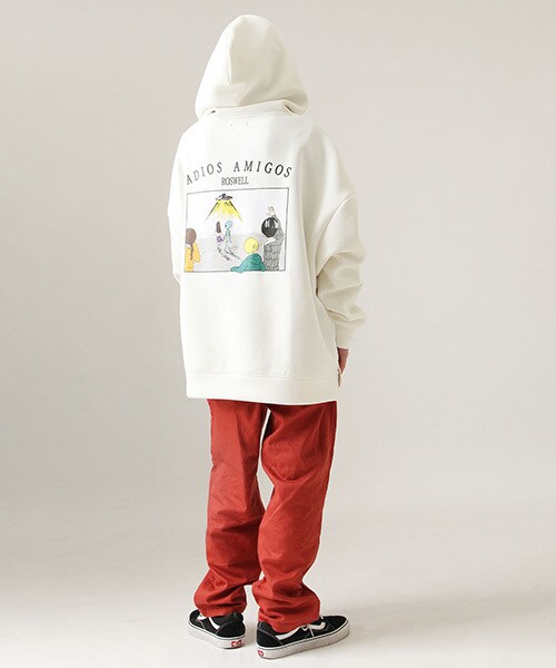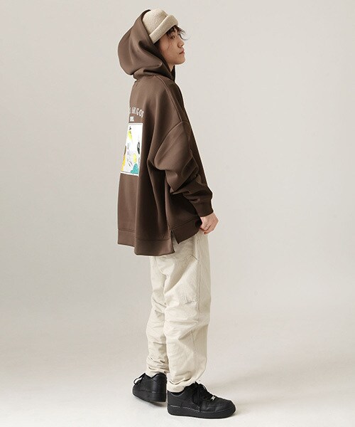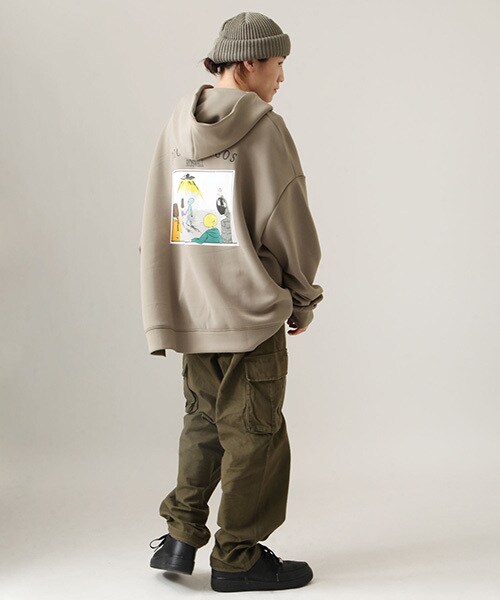 ゆったりと余裕のある身幅が作り出すビッグシルエットと、個性的なイラストをプリントしたプルパーカー。
