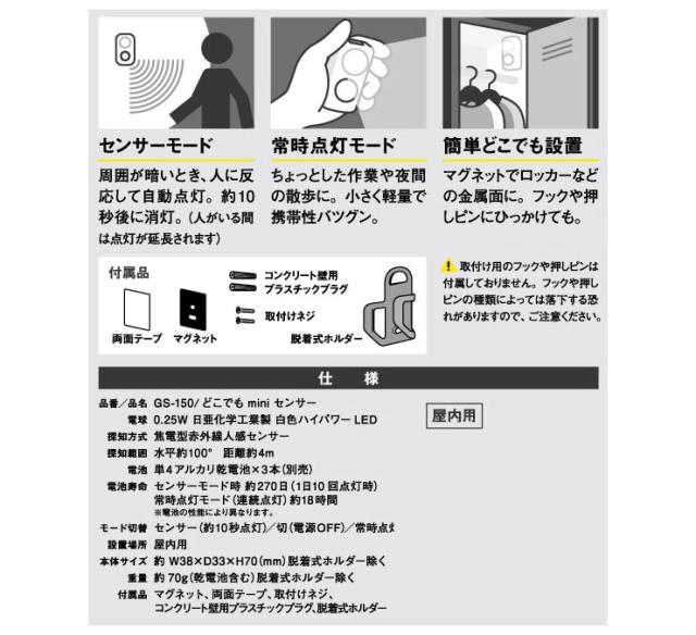 センサーライト LED ムサシ どこでも mini センサー GS-150 RITEX ライテック 室内 自動点灯 人感センサー 簡単設置 コンパクト(代引不可