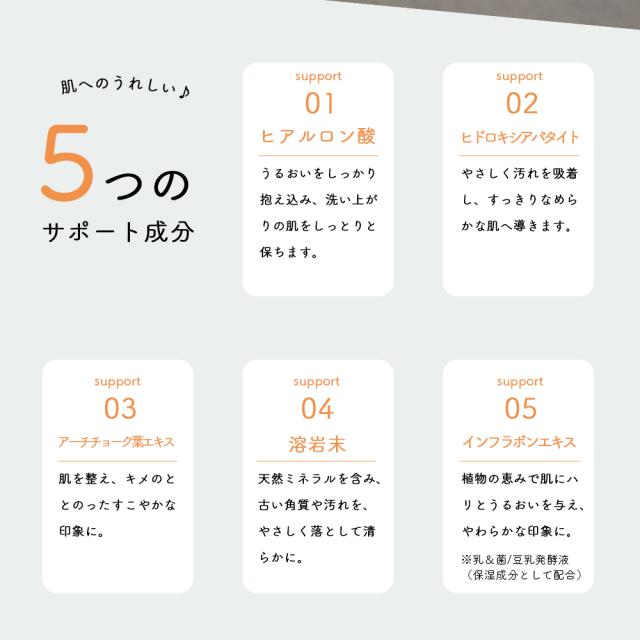 | 全成分 | カリ含有石ケン素地、DPG、水、スクロース、ソルビトール、PPG-10メチルグルコース、グリセリン、パルミチン酸、乳酸菌/豆乳発酵液、エチドロン酸4 Na、グリセリルグルコシド、アセチルヒアルロン酸Na、ヒアルロン酸Na、ヒアルロン酸クロスポリマーー2ーNa、加水分解ヒアルロン酸Na、ペンチレングリコール、エチルヘキシルグリセリン、水添レシチン、フィトステロールズ、セラミドNG、セラミドAP、セラミドAG、セラミドNP、セラミドEOP、ヒドロキシアパタイト、溶岩末、BG、アーチチョーク葉エキス、香料 |