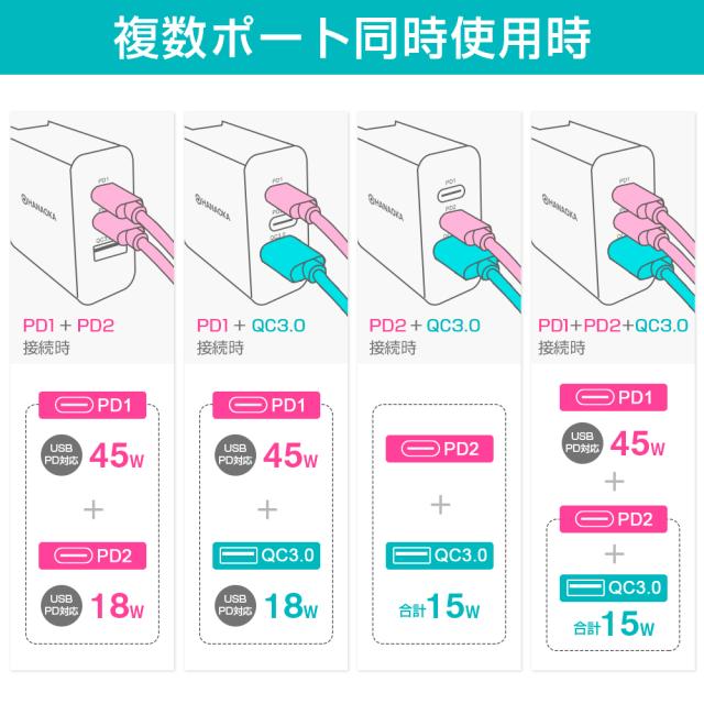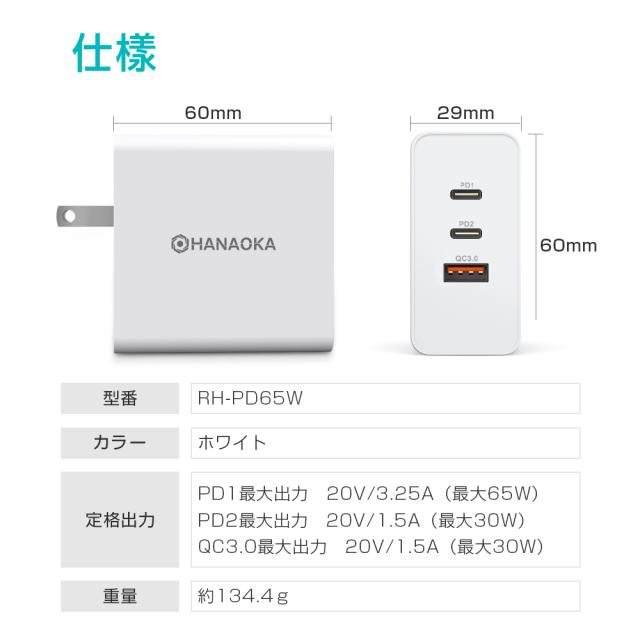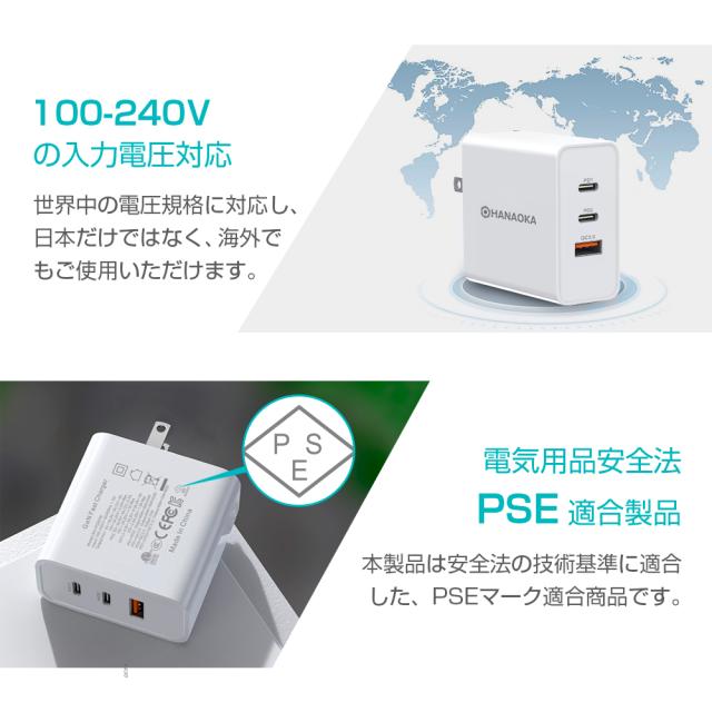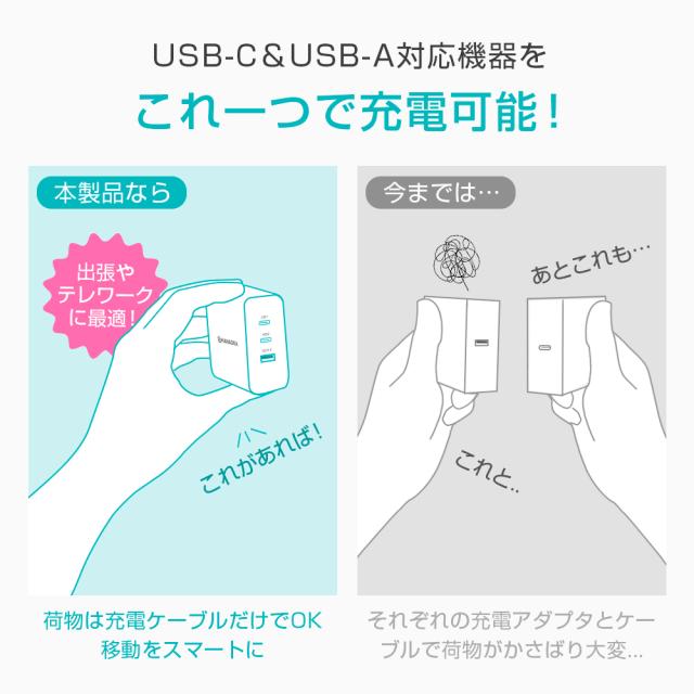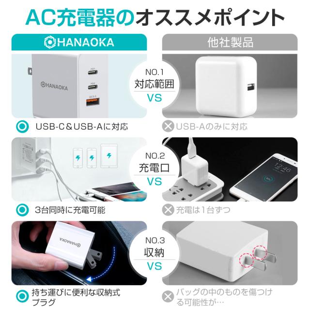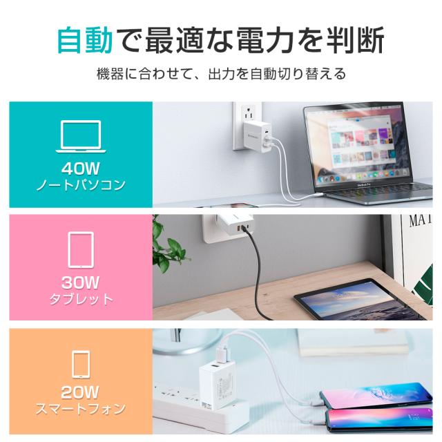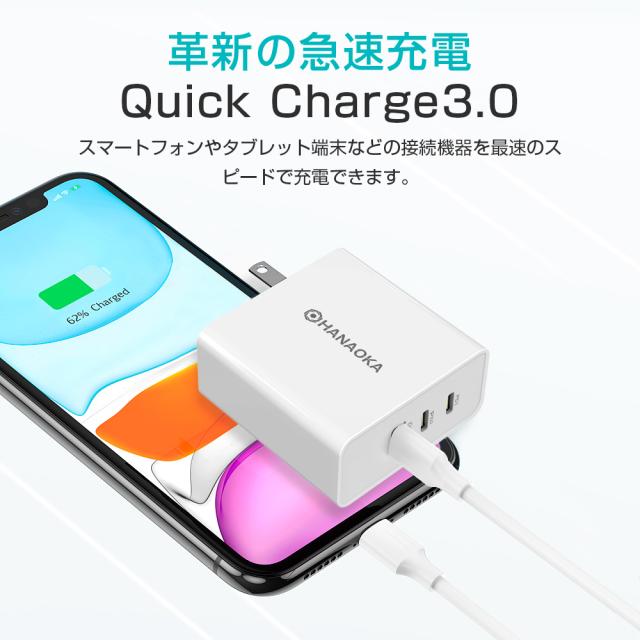 ■保証期間:3ヶ月 ■【急速充電&自動判別機能付き】スマートフォン/モバイルバッテリー/ノートパソコン/タブレット/ ワイヤレスイヤホンなど、様々なUSB機器をフルスピードで充電可能で、スマートフォンなどのデバイスに最適な電圧・電流を調整 し、デバイスに合わせた高速充電を最適化とします。 ■【最新素材GaN&3台同時充電可能】最新素材のGaN(窒化ガリウム)を採用し、高出力でありながら、発熱を抑えます。同時 に軽量・小型化も実現し、プラグを折り畳むことができます。さらに、USBポート3個付きで、デバイス3台同時充電も可能とな ります。