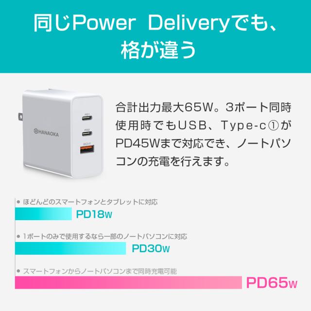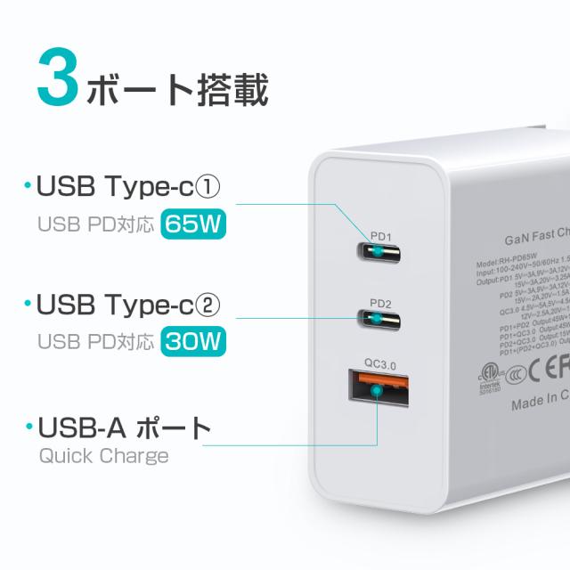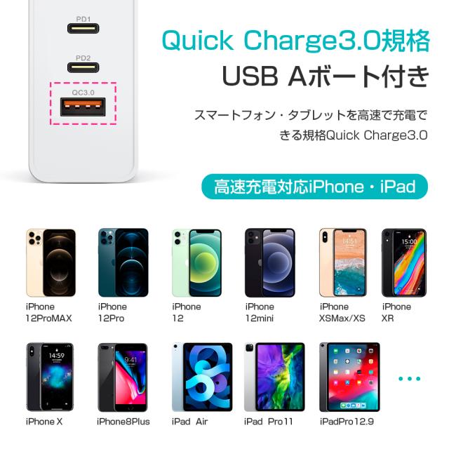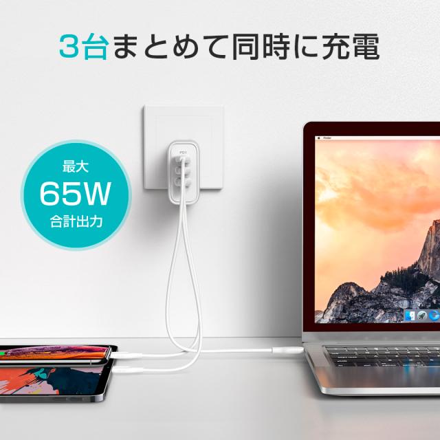 急速充電器 折畳式プラグ搭載 3ポート PD&QC3.0対応 最大65W 折りたたみ式 スマホ充電器 ACアダプター iphone12 Mini 11 Pro XS iPad Galaxy Xperia 対応