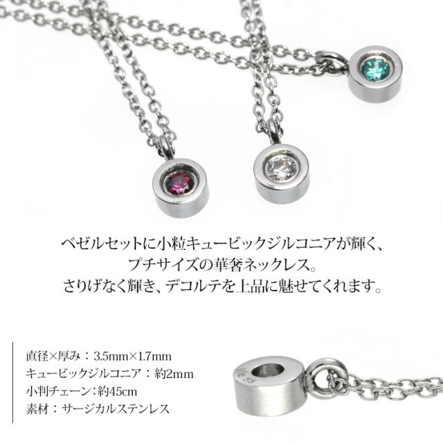 ベゼルセットに小粒キュービックジルコニアが輝く、プチサイズの華奢ネックレス。 さりげなく輝き、デコルテを上品に魅せます。 着けっぱなしにしていたり汗をかいても痒くならない、サージカルステンレス製だから 金属アレルギーの方にも安心してご使用いただけます。 温泉や海で変色する心配もないので、どこへ行く時もいつも着けていられます。 ネックレスチェーンはデザインにあわせカット小判チェーンを使用しております。