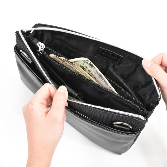 メインルームは仕切りやポケットで小物の整理がしやすい設計になっています。また、中央のファスナーポケットは紙幣や小銭をそのまま入れ、お財布代わりにすることもできます。