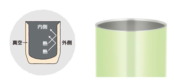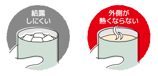 | 結露しにくい 冷たい飲み物を入れても結露しにくいので、テーブルが濡れるのを軽減できます。 | 外側が熱くなりにくい 熱い飲み物を入れても外側が熱くなりにくく、小さなお子様やお年寄りにも安心です。 |