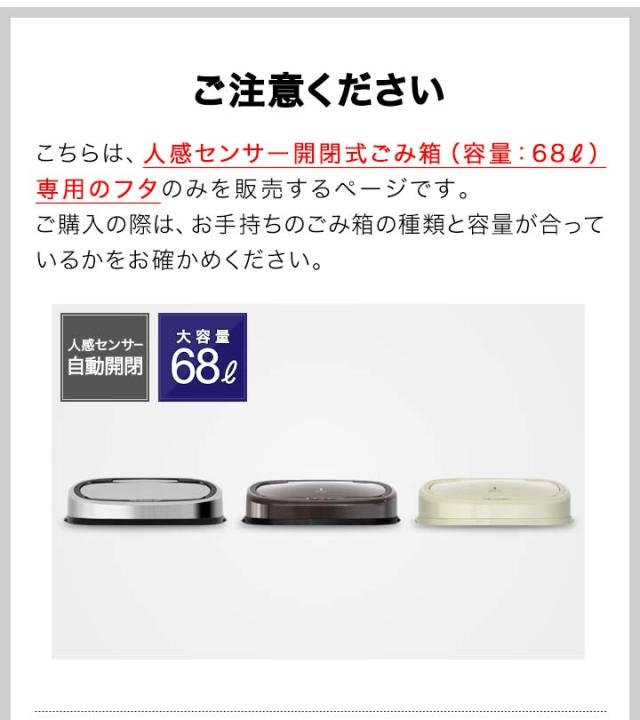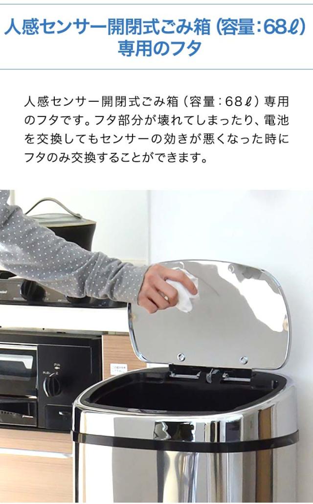 | 特記事項: ※本商品には電池は付属しておりません。 ※こちらは「人感センサー自動開閉式ごみ箱(容量:68?)」交換用のフタとなります。 本体は付属しませんのでご注意ください。 |