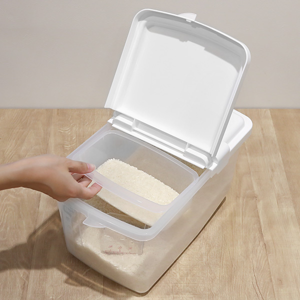 フタが半分だけ開くので、外したフタの置き場所に悩むことがなく、狭い場所でも簡単にお米の計量を行うことができます。中央の留め具を外すとフタ全体を開けることもでき、お米の移し替えやお手入れの際に便利です。