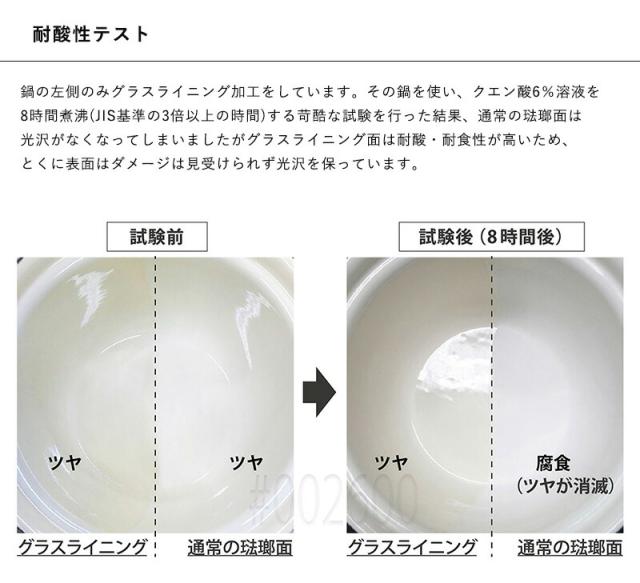 製造工程上避けられないもので、安心してご使用頂けます。このような理由での交換・返品はお受けできかねますのでご了承ください。 ・IH調理器でのご使用の際は、湯沸かしモードは使用しないでください。急激な温度上昇により琺瑯層を傷める恐れがあります。 ・IH調理器では、レベル「中」以下からはじめて、徐々に温度を上げてご使用ください。 ・ 商品の取扱い表示に従ってお取扱いください。 ・ お客様のモニター環境または撮影時の照明環境により 画像色が実物と異なる場合がございます。 |