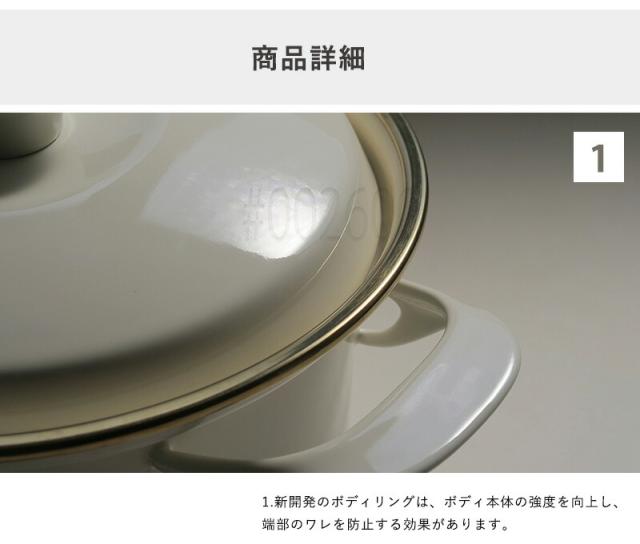 | ※ご注意 | ・ ホーロー製品は手作業で釉薬をかけておりますので、多少の個体差がございます。鍋本体や蓋に黒点や塗りムラが見られる場合がありますが、