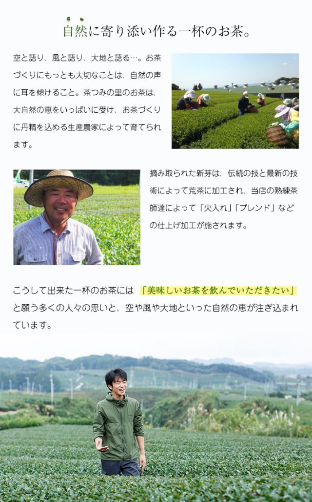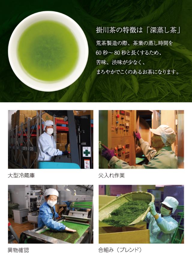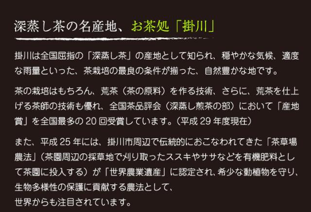 全国屈指の茶産地静岡県掛川市より産地直送でお届けします。掛川は全国屈指の深むし茶の産地として知られ、穏やかな気候、適度な雨量といった、茶栽培の最良の条件が揃った自然豊かな地です。