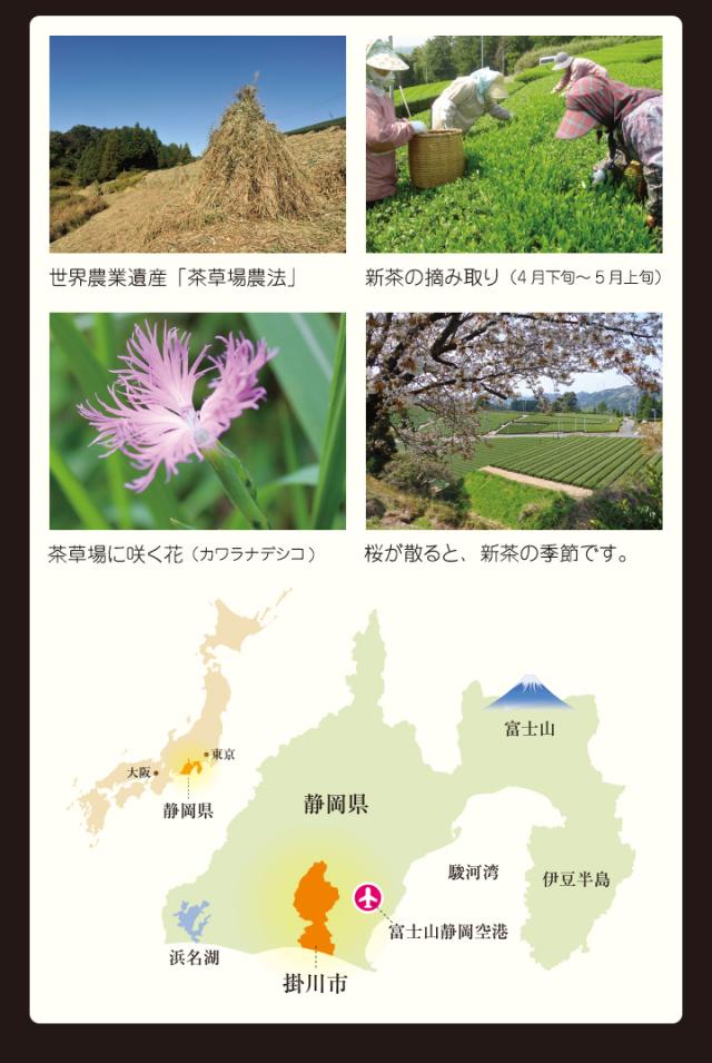 また、平成25年には、掛川市周辺で伝統的におこなわれてきた「茶草場農法」が「世界農業遺産」に認定され、希少な動植物を守り、生物多様性の保護に貢献する農法として、世界からも注目されています。