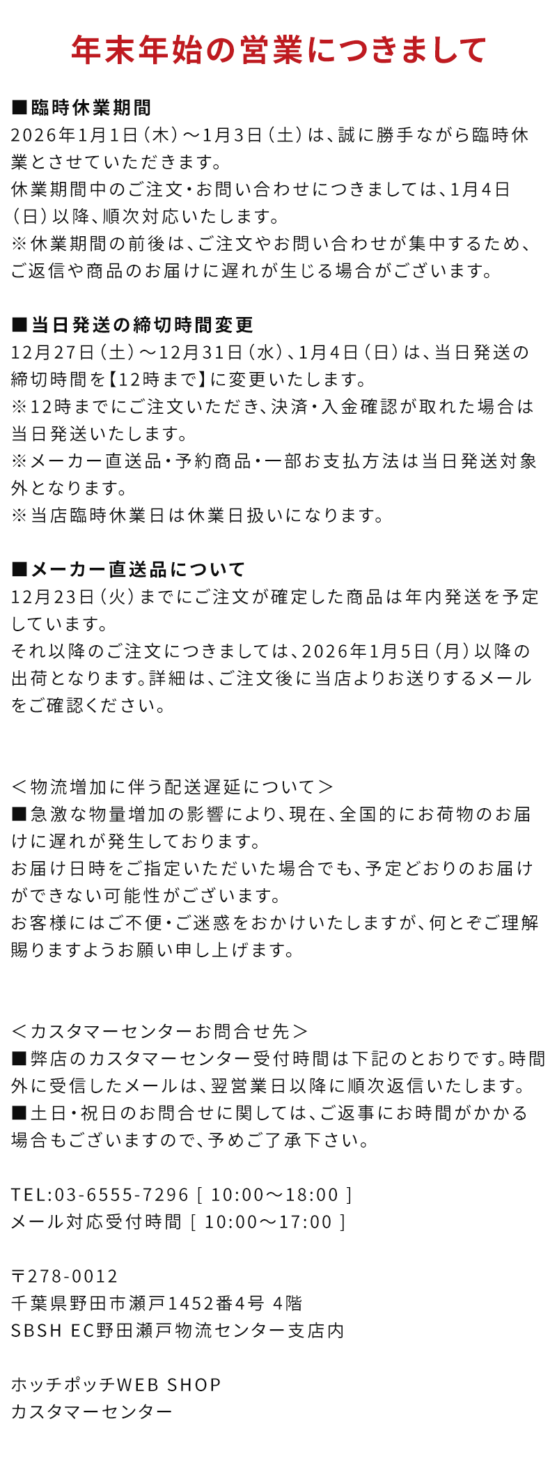 2026年1月1日(木)〜1月3日(土)は臨時休業とさせていただきます。12月27日〜31日、1月4日の当日発送の締切時間は【12時】に変更になります。