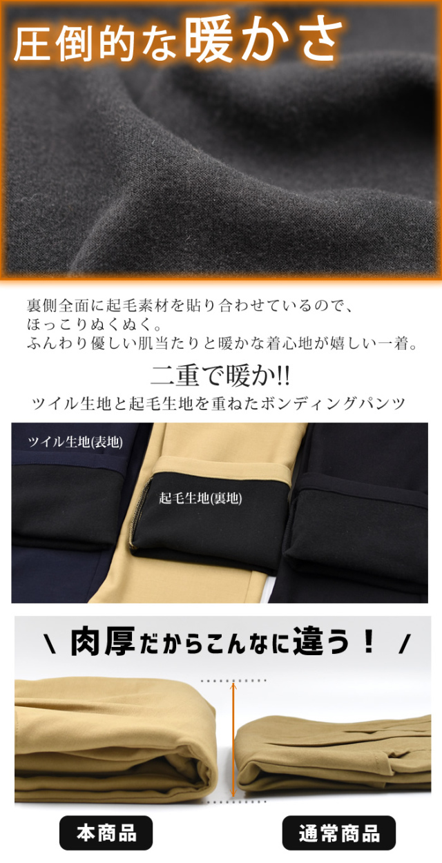 冬にピッタリの暖かい裏起毛ボンディングパンツ。