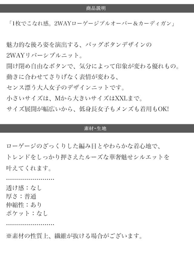 ![]() ![]() ![]() ![]() ![]() ![]() ![]() ![]() ![]() ![]() ![]() ![]() ![]() ![]() ![]() ![]() ![]() ![]() ![]() ![]() ![]() ![]() ★2WAYマルチウェイニット ミドル丈無地ローゲージプルオーバー&カーディガン(長袖)★ 魅力的な後ろ姿を演出する、バッグボタンデザインの2WAYリバーシブルニット。 開け閉め自由なボタンで、気分によって印象が変わる優れもの。 ・ボタンを後ろにしてプルオーバーニットとして。 ・ボタンを前側にして開けてカーディガンとして。 ゆったりビッグシルエットとざっくり編みニットで、 今年トレンドをしっかり押さえたルーズな華奢魅せシルエットを叶えてくれます。 首元はすっきりとしたクルーネックタイプ。 レビュー商品の評価: