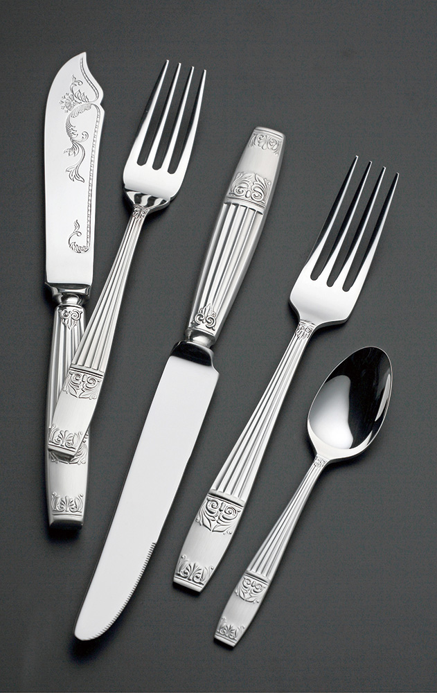 ロッキンガムの彫刻模様は古代ギリシャ神殿の円柱にならったもの。格調高いクラシックデザインは、フォーマルな食卓で一段と豪華な輝きを放ちます。