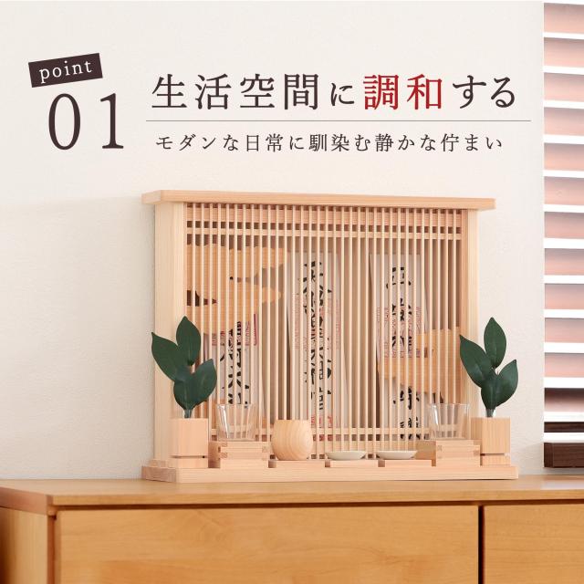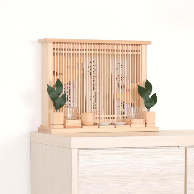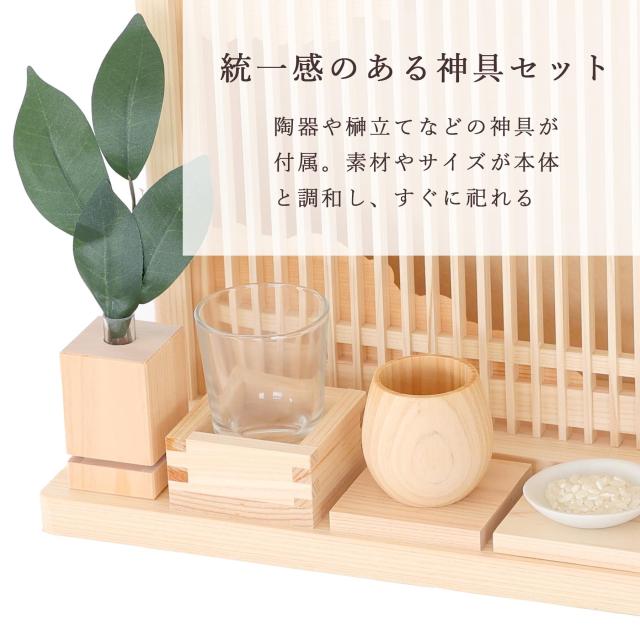 神具には素焼き陶器とグラス、桧材の組み合わせ、「和」のテイストあふれる一式です。神様へのお供え物も、きれいな器に入れて、心を込めて。