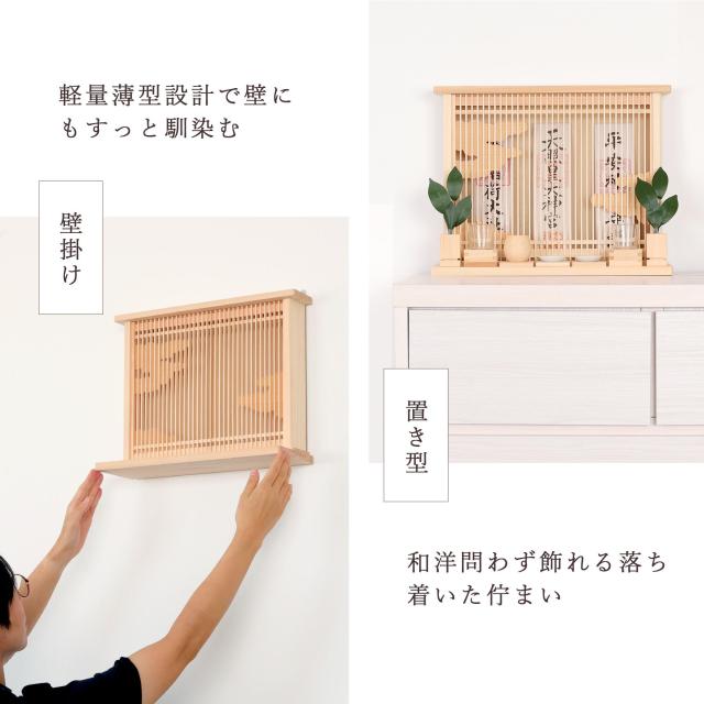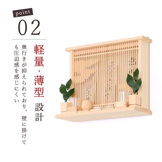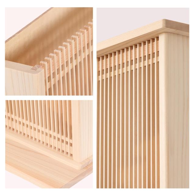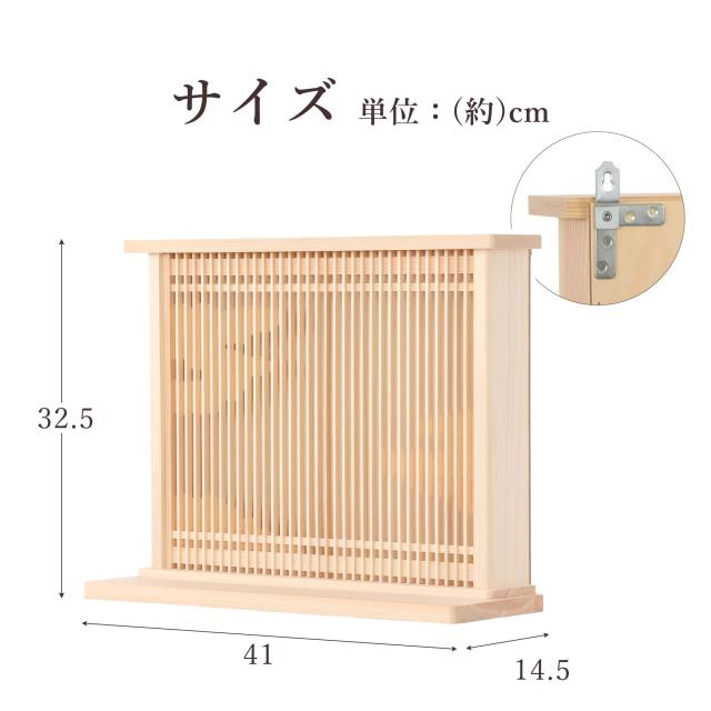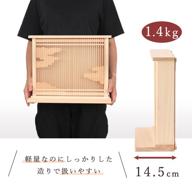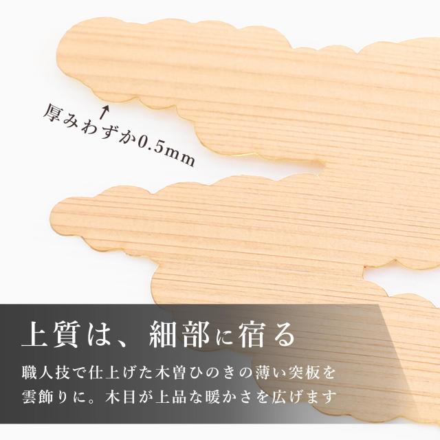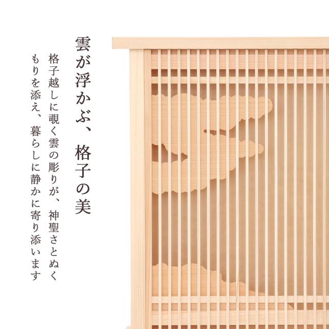 薄型のシルエットは壁掛けしても、お部屋のインテリアにすっと馴染み、和室・洋室を選ばず設置できます。日本建築の美しさ「千本格子」と、薄い木曽桧の「突き板」を雲の飾りに、暖かくやさしい雰囲気。岐阜県と長野県の県境辺りで産出される、とても良質な桧材を使って組み上げています(背面は合板)。