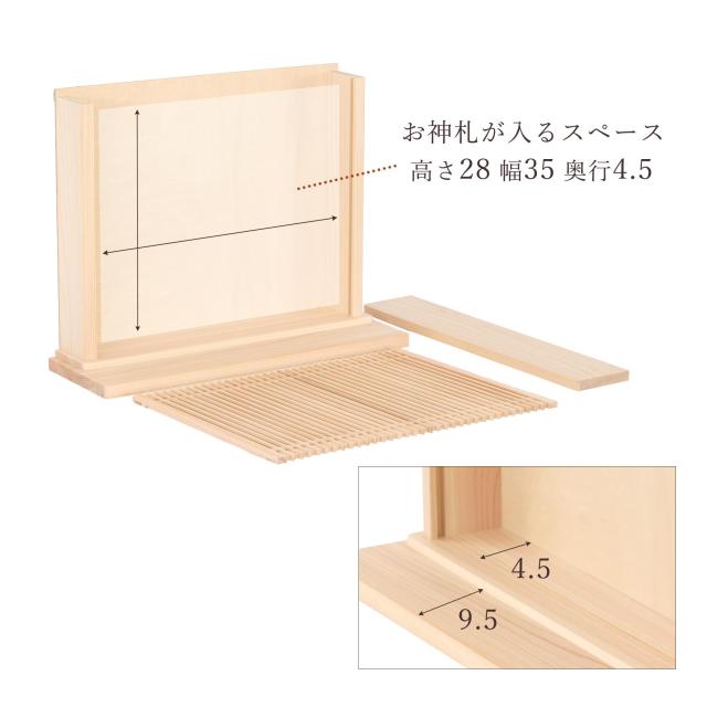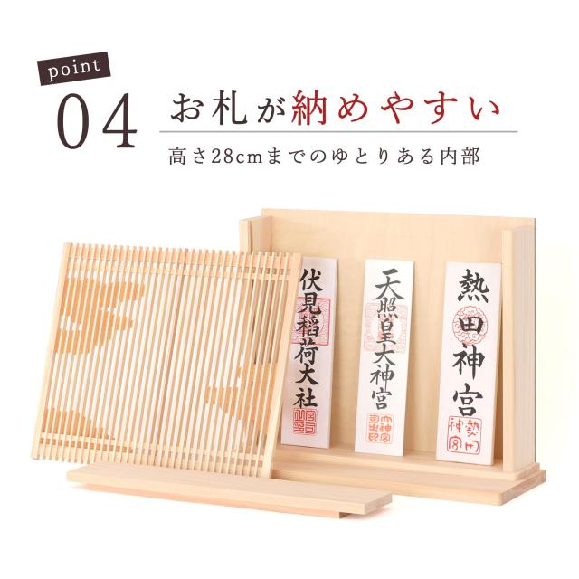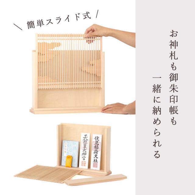 大きいお神札や御朱印帳なども収めやすい作りとなっており、前面が取り外せる構造です。お守りなども、お神札と一緒に納められる奥行があります。