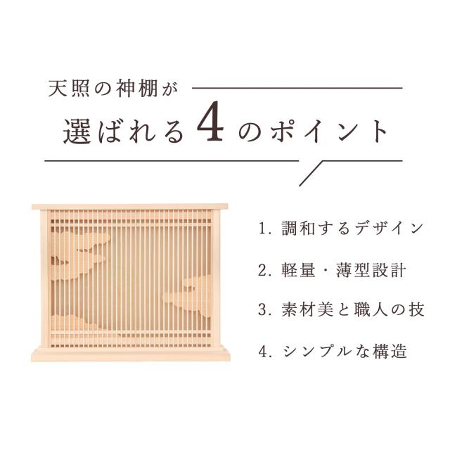 清く正しく美しく、お祀りします。天上の世界、アマテラス様がお見えになる神の域をイメージして、雲間の向こうにお神札を収めます。「天照大御神」は中央に、その他のお神札も合わせて3枚並べられる、コンパクトな「三社宮」のサイズです。