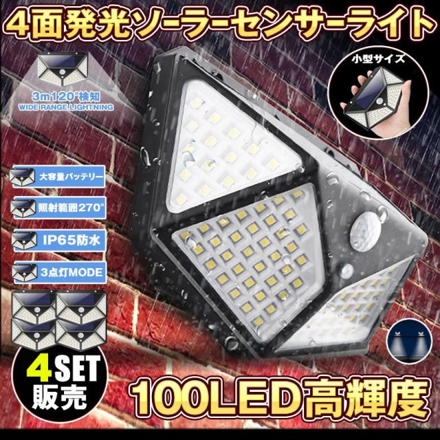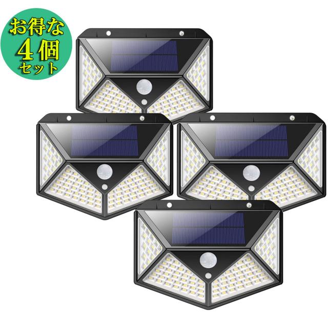 センサーライト ソーラーライト 4個セット 100LED 屋外 4面発光 高輝度 防犯 人感 防水 屋外照明 300°照明範囲 防犯ライト 3つ知能モード 太陽光発電 庭 玄関 駐車場 通路 ガーデンライト 大活躍