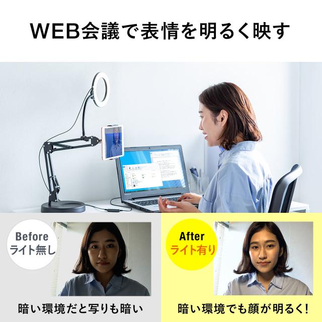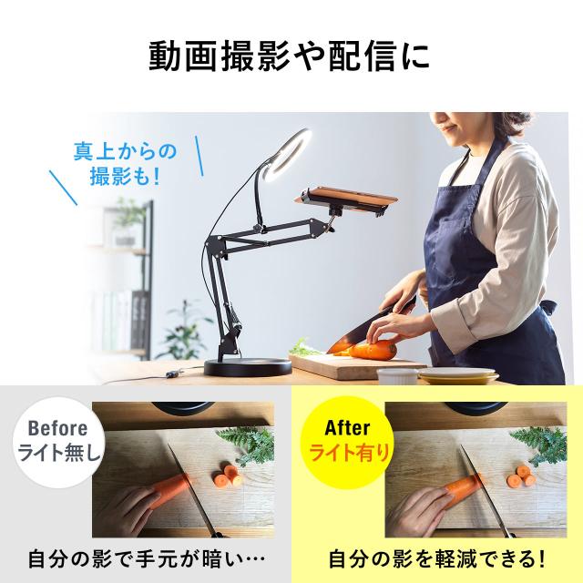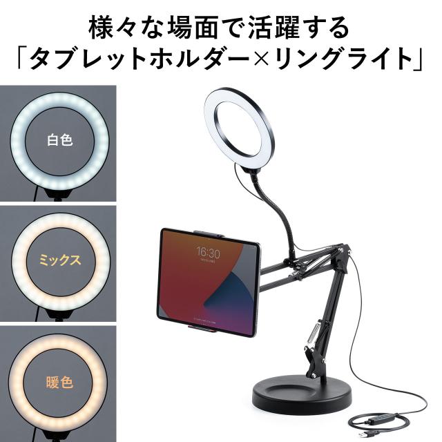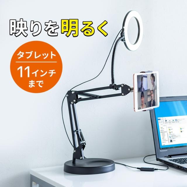 ●動画配信や小物の撮影に役立つLEDリングライト付きタブレットスタンドです。●LEDリングライトが顔や小物を明るく照らします。