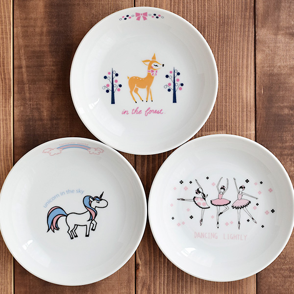 こちらのカレー皿は軽量磁器素材の食器。軽くてお子様も持ちやすく、扱いやすいのがポイントです。イラストは、「ユニコーン」「バンビ」「バレリーナ」の3種類。