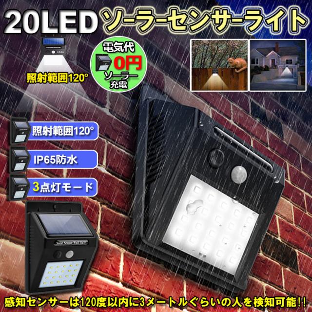 センサーライト ソーラーライト 20LED 屋外 3つ知能モード 高輝度 防犯 人感 防水 屋外照明 120°照明範囲 防犯ライト 夜間自動点灯 太陽光発電 庭 玄関 駐車場 通路 ガーデンライト 大活躍