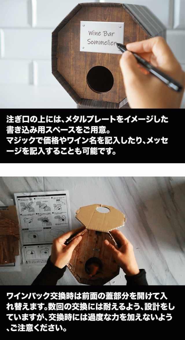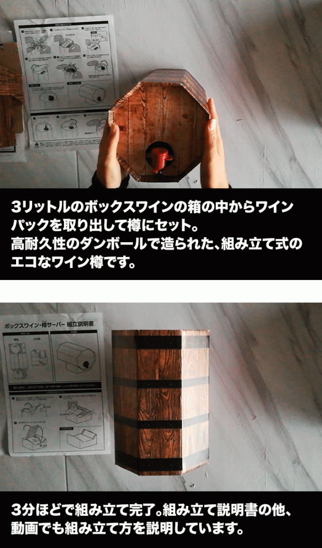 ご注意:本製品は、組み立て式のダンボール製のワイン樽型サーバーとなります。3リットルのボックスワインの内容物(ワインパック)を入れ、サーバーとして使用することが出来ます。