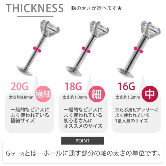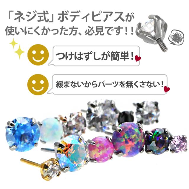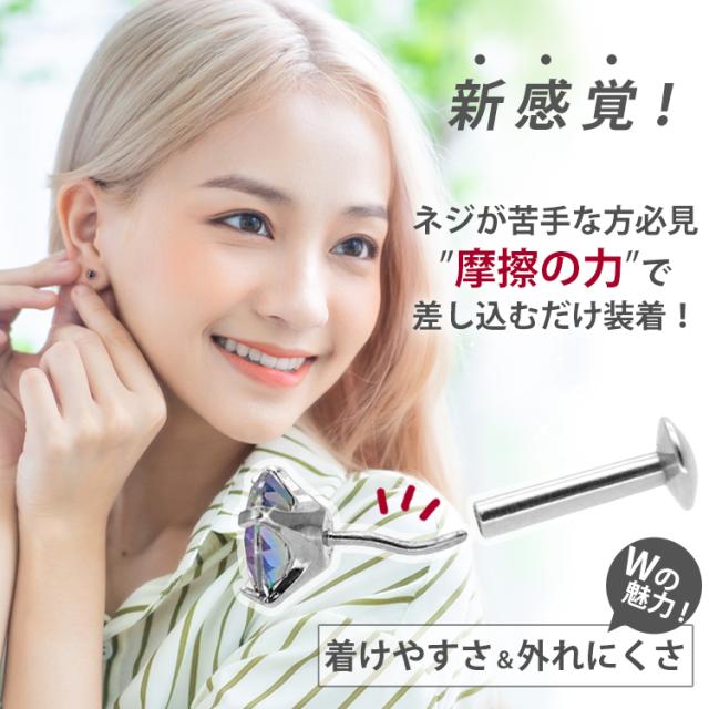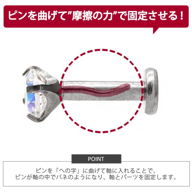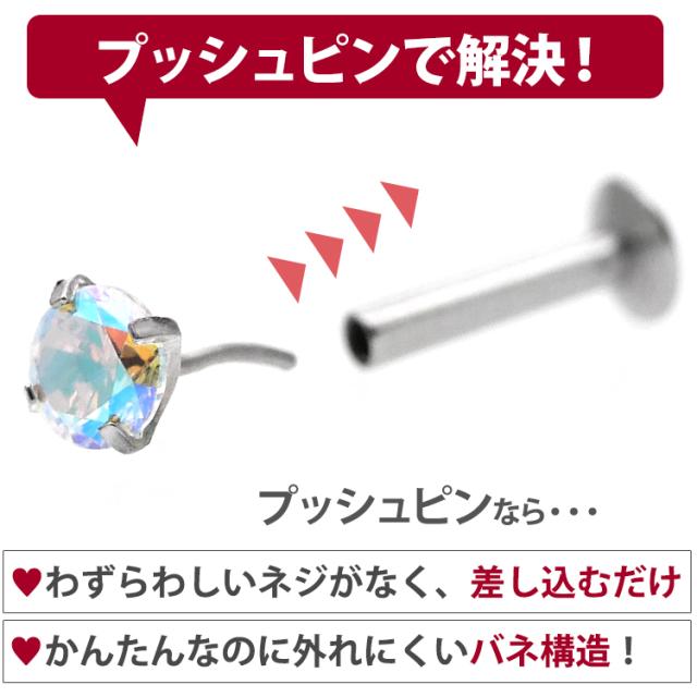 ボディピアスの定番アイテム、ラブレットスタッドがワンプッシュタイプの斬新設計に! ありそうでなかった、ネジ不使用のボディピアスが登場! トラガスのような狭い部位や、ネジタイプが苦手な方には特にお勧めです。 3サイズのジュエルサイズから、お好みの組み合わせでお選びいただけます!簡単に取り付けられることがプッシュピン最大の魅力です♪ヘッド部分から伸びるピンを曲げて、お好みの硬さに調節可能。差し込めば装着完了です!ネジが無いので、知らない間に緩んできて失くしてしまった、そんな悩みからも開放されます!