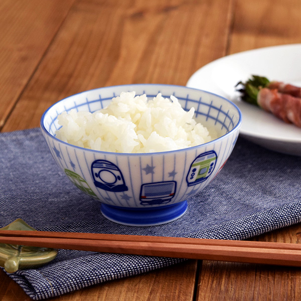 扱いやすい磁器の器に、可愛らしい電車のイラストがプリントされたキッズ用茶碗。