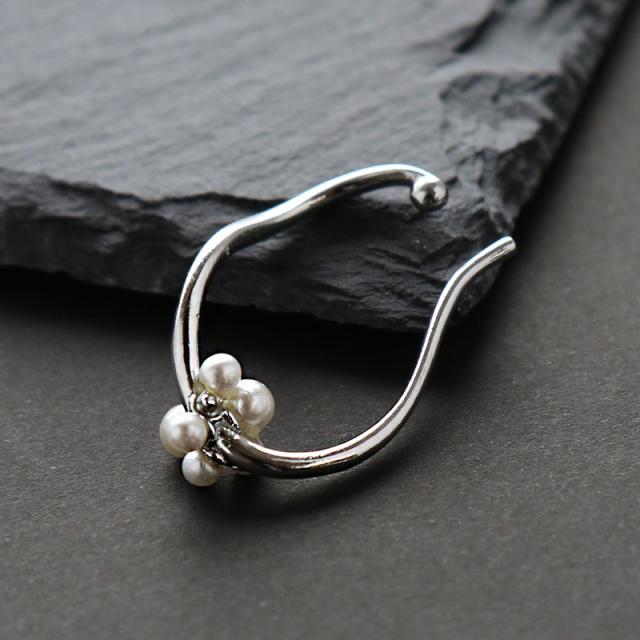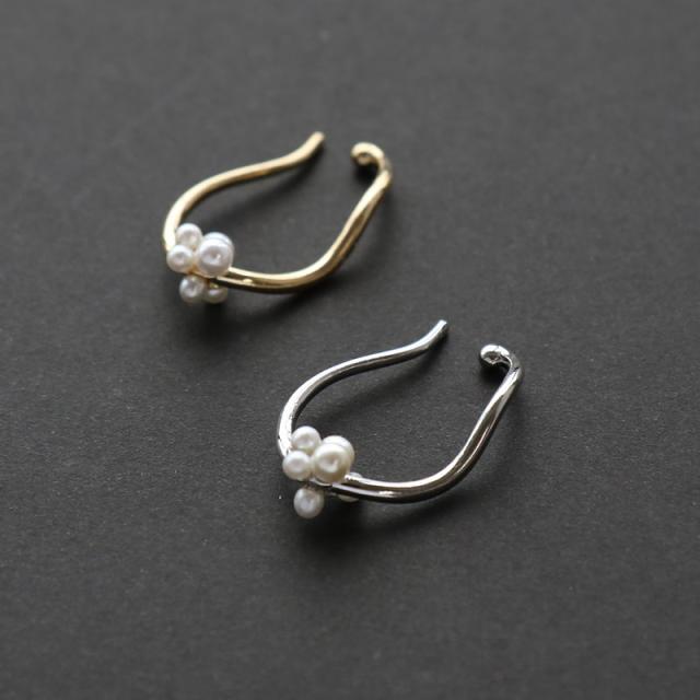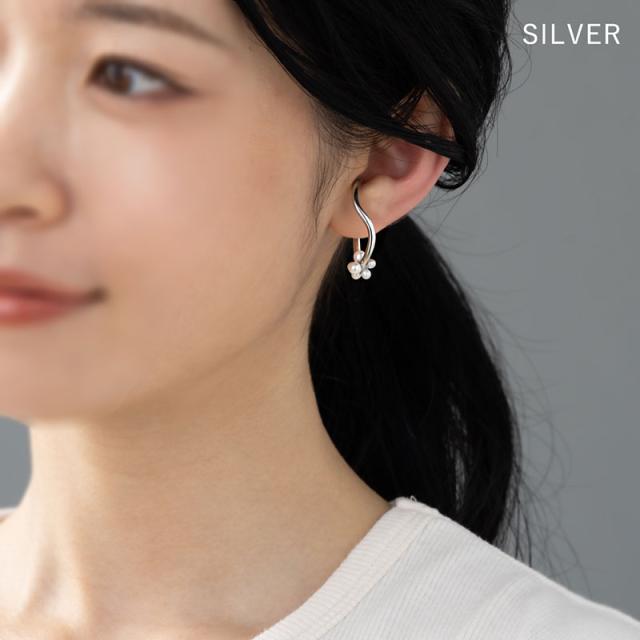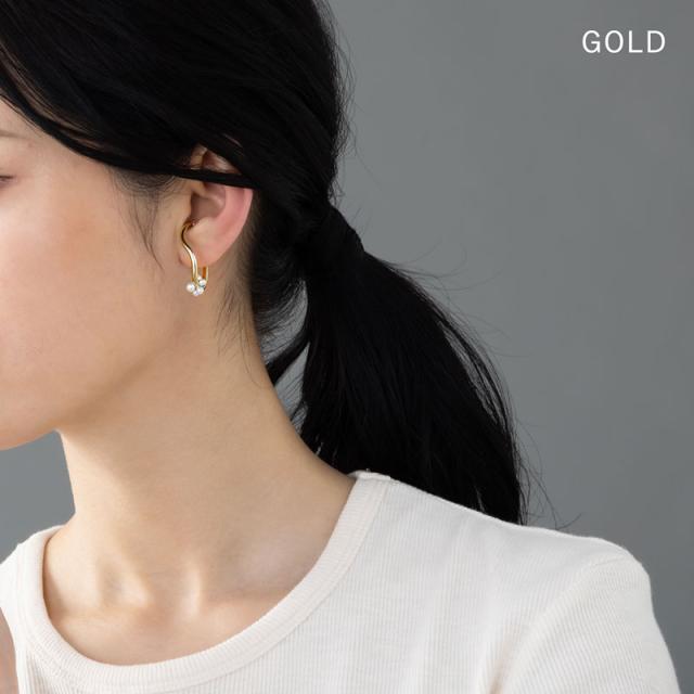 | 耳の上部と軟骨部分を挟むように引っ掛けるウェアリング(イヤーカフ)です。 緩やかなカーブラインと小粒で可愛らしいパールが耳元に映え、コーデを引き立ててくれるデザイン。 ノンホールの方でも気軽に耳元のオシャレが楽しめます! | |