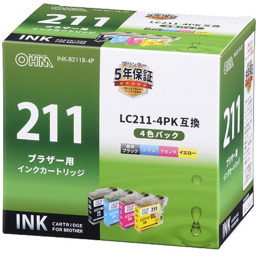 ●顔料ブラック(LC211BK互換)、シアン(LC211C互換)、マゼンタ(LC211M互換)、イエロー(LC211Y互換)