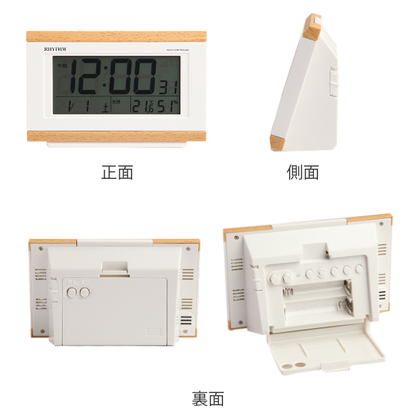 温度、湿度、カレンダー、六曜を表示を出来ます。また時刻優先や日付優先等、表示位置を切り替えることが出来るので、使い方に合わせて表示形式をお選び頂けます。