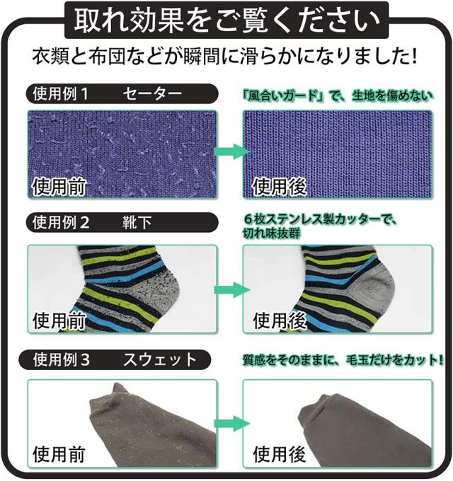 - ニットやパーカー、子供のズボン、靴下などに大活躍。毛足の長さによって高さを調整して使い分ければ衣類が傷む心配が無さそうです。毛玉の溜まり具合が外から見えない点が不便なためマイナス1です。
