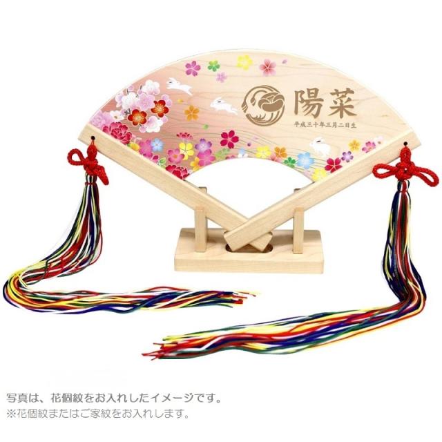 吉祥檜扇飾り レーザー彫家紋(または花個紋)・お名前・生年月日入り はねうさぎ 台付き 高さ16.5cm (601200) 木製 名前入り扇 雛人形