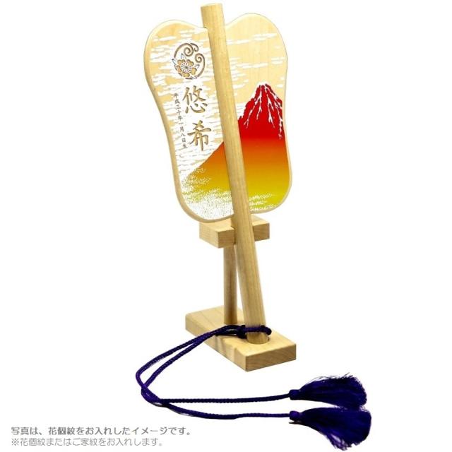 吉祥軍配飾り レーザー彫家紋(または花個紋)・お名前・生年月日入り 赤富士 台付き 高さ29cm (600735) 木製 名前入り軍配 五月人形