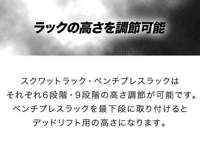 | ベンチプレスラック高さ: (約)110cm105cm/100cm/95cm/90cm/85cm/80cm/75cm/70cm/33cm(デッドリフト用) |