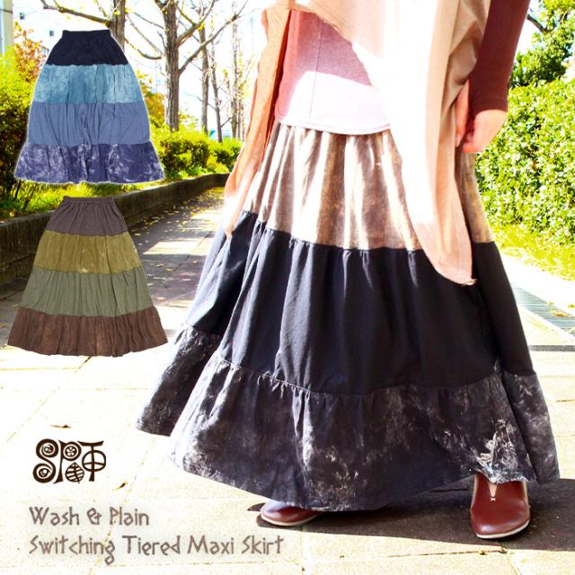 【メール便OK】 ロングスカート エスニック レディース 【SPT】ウォッシュ&プレーン切り替えティアードマキシスカート 2025年