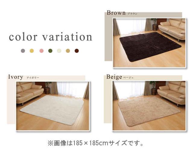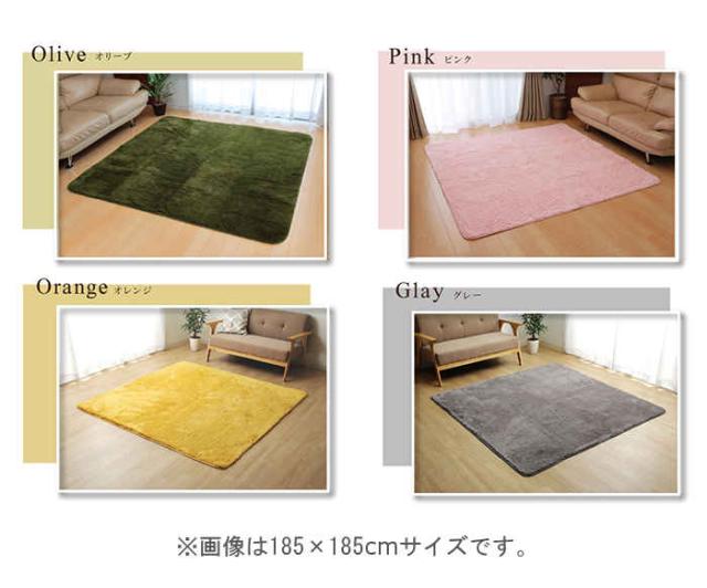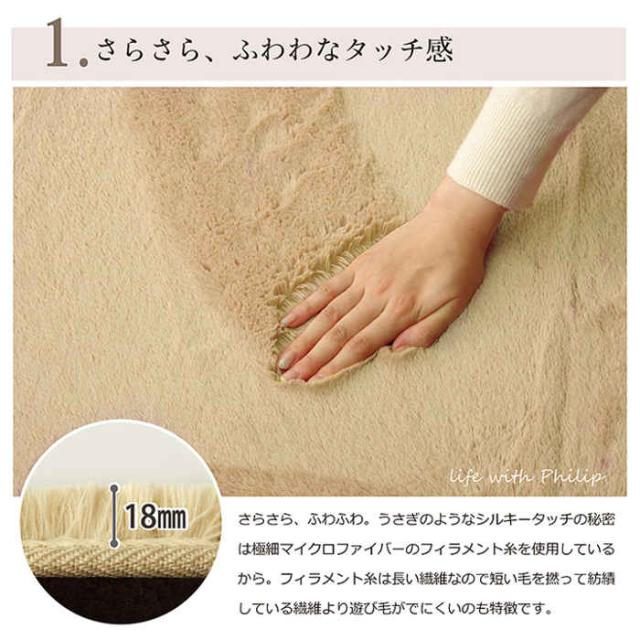 カラーが選べる多色展開です。バリエーションは、ベージュ(JAN:4956642067986/型番:4609509)、ブラウン(JAN:4956642068013/型番:4609559)、アイボリー(JAN:4956642068044/型番:4609609)、ピンク(JAN:4956642155263/型番:4609659)、オリーブ(JAN:4956642540304/型番:3961259)、グレー(JAN:4956642754275/型番:3967809)、オレンジ(JAN:4956642754329/型番:3967859)です。表地にフィラメント糸(極めて長い繊維)を使用しています。遊び毛が出にくく、耐久性に優れています。パイルの長さは約18mmと適度な長さで、しっとりふわふわとしたやさしいタッチ感を出しました。フローリングを傷つけにくいよう、裏には不織布を貼っています。