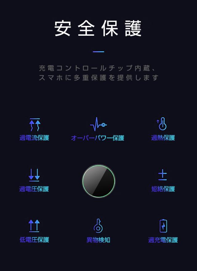 【安全性&保護機能】ROHS認証、FCC認証、CEマーク認証等の認証が多く取得しており、安全性は十分保証できます。また、知能チップの搭載により、過電圧保護、温度調整、異物検知、過充電防止などの保護機能が多数備えており、お使いのスマホをしっかり守ります。