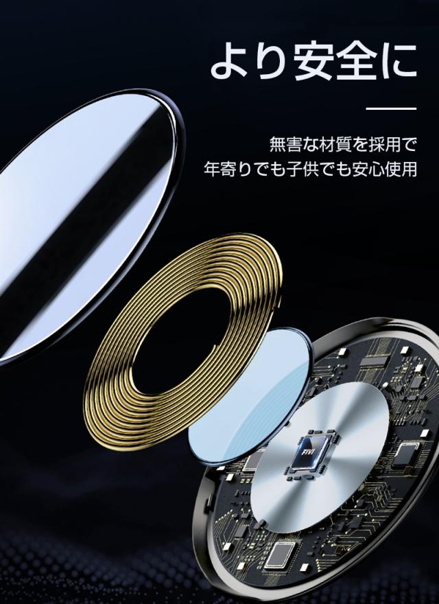 【置くだけ充電】電磁誘導の原理を用いて、送電する側と受電させる側とのあいだに誘導磁束を発生させ充電する方式です。磁力を用いて、ケーブルにつながなくても置くだけで充電できます。また、強化ガラスを使用することで、防水性能アップし、使用がもっと安心になります。
