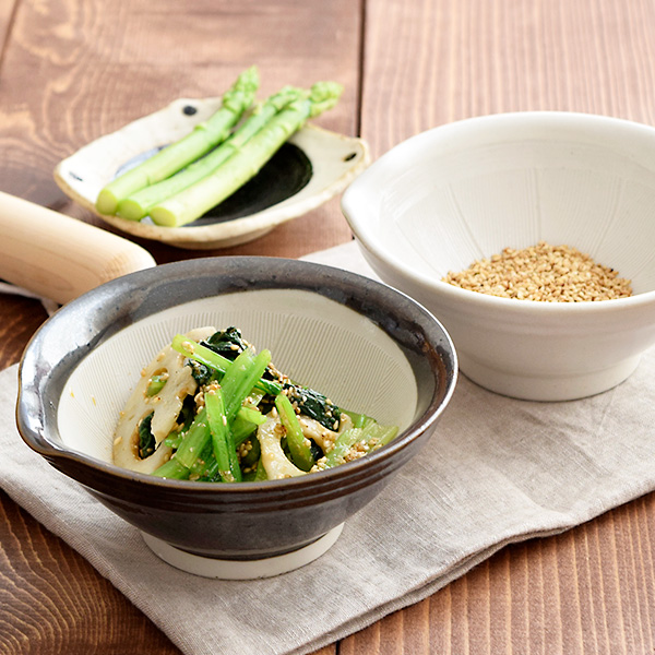 手軽にゴマが擂れて、テーブルの上にあっても邪魔にならないサイズ。和え物をそのまま出しても◎です。