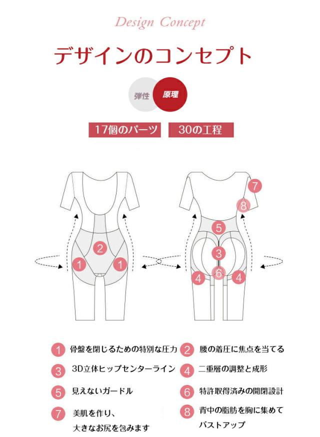 オープンバスト仕様で背中から胸を寄せて上向きバストを形成。 開いた骨盤を元の位置へ整えてくびれたウエストに。
