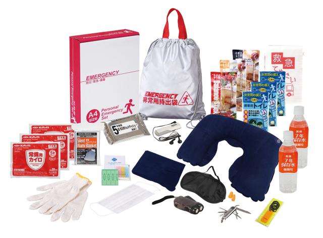非常持出袋・防災用ウェットティッシュ・静音アルミブランケット・7年保存水×2・カイロ×3・救急てぬぐい・軍手・バランススティック×3・8徳ナイフ・マスク・FMラジオ・フラットホイッスル・ダイナモLEDライト・ネックピロー・アイマスク・耳栓・綿棒&バンソウコウ・携帯用トイレ1P×3