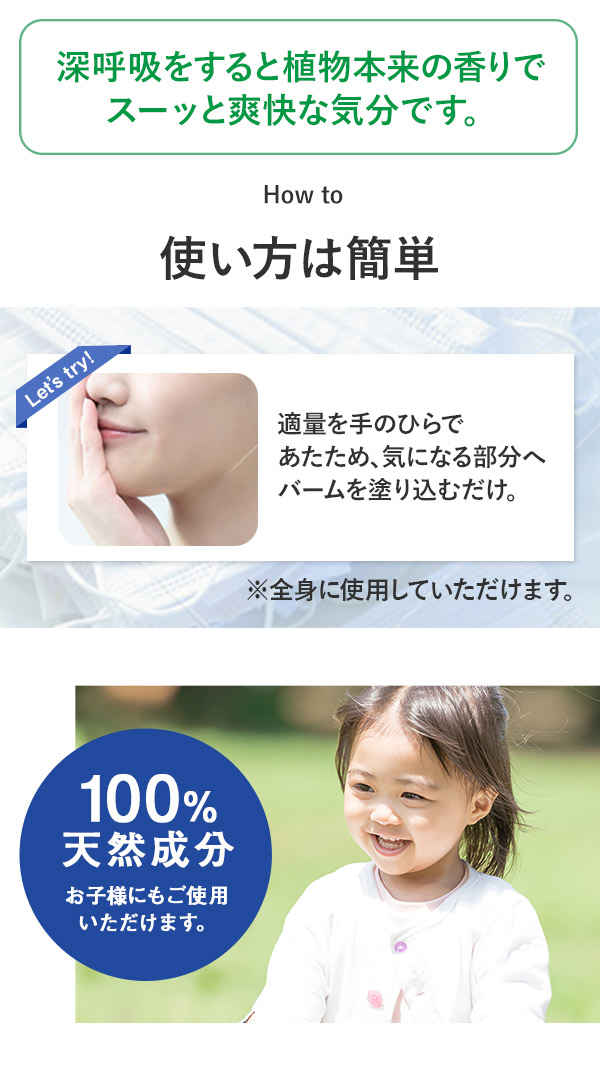 【特徴】天然成分100%のオーガニック原料とエッセンシャルオイルを使用したアロマバームで爽快な気分に。ホホバオイルをベースにオーガニックのビーワックス(蜜蝋)と、オーガニック栽培された植物から抽出した天然のエッセンシャルオイルで香りづけしました。手のひらであたためて気になる部分へ。深呼吸をするとスーッと爽快な気分が楽しめます。【商品スペック】内容量:35g原材料:ホホバ種子油※、ミツロウ※、ユーカリ葉油※、ハッカ油※、ローズマリー葉油※、ティーツリー葉油※、アトラスシーダー木油※ ※:オーガニック原料