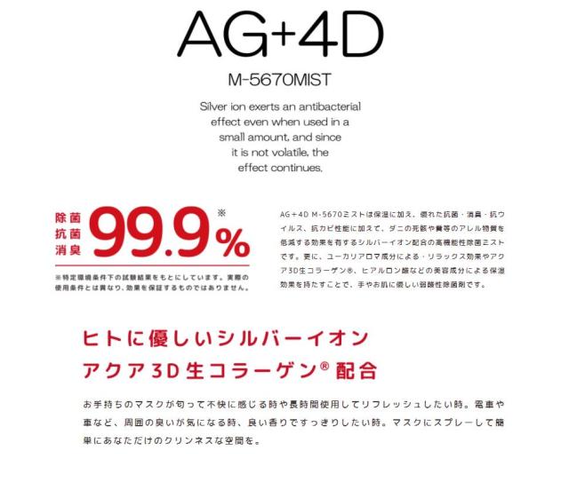 ダニの死骸や糞等のアレル物質を低減する効果を有するシルバーイオン配合の高機能性除菌ミストです。