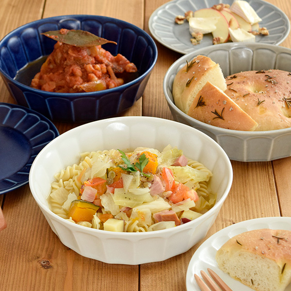 こちらのボウルは19.5cmで縁が立ち上がっている形で、カレーやパスタ、シチューやサラダだけでなく、カフェ風丼ぶりや煮物の盛り付けなど幅広くお使いいただけます。