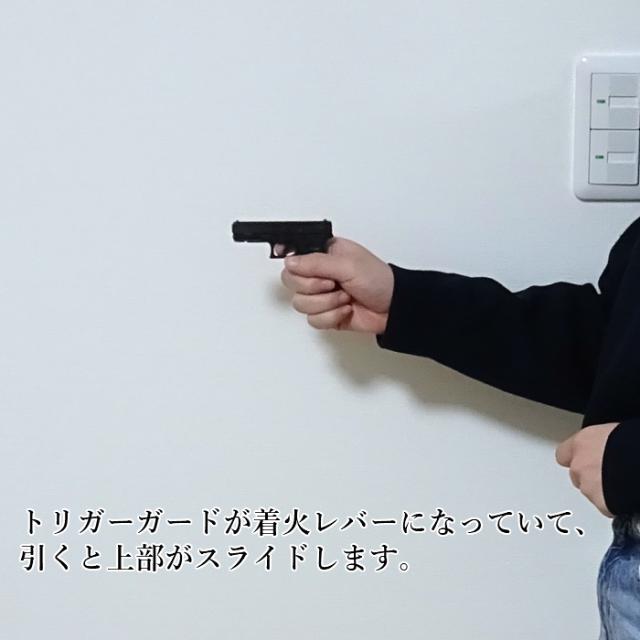 トリガーガードが着火レバーになっていて、引くとなんとこのサイズなのに上部がスライドします。