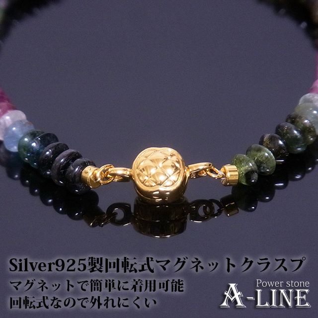 ボタン型トルマリン(マルチカラー)5.5mm、金色SILVER925製回転式マグネットクラスプ、形状記憶超弾性ワイヤー、ワンプッシュ(真鍮製金メッキ処理)