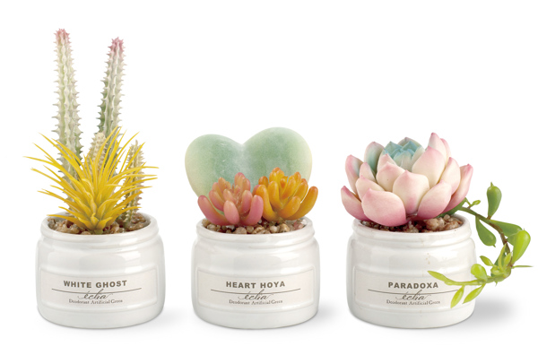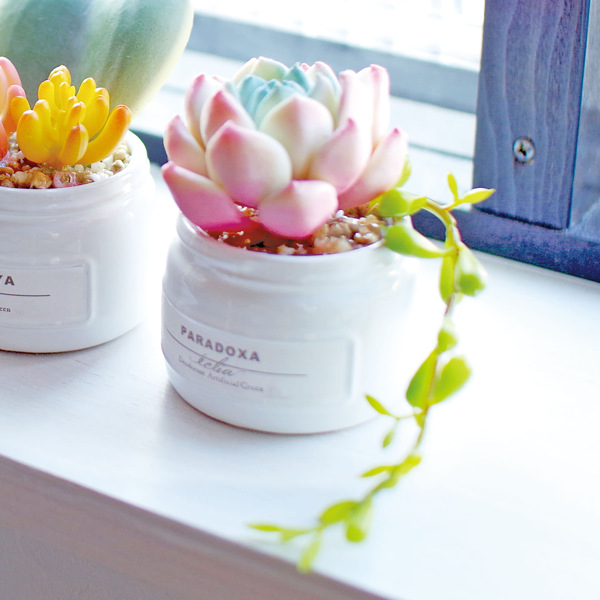まるで本物のように繊細に作られた人工の観葉植物です。ぷにっと肉厚な外観がリアルでとても可愛いらしいです。ホワイトゴースト、ハートホヤ、パラドクサの3個セットです。鉢は陶器製でより本物のような雰囲気を演出します。手のひらに乗るサイズ感なので玄関やキッチン、リビングなど小さな空間にも最適です。