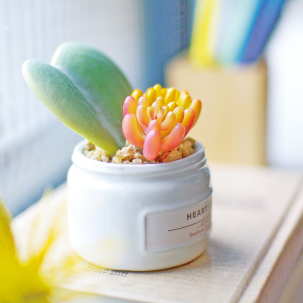 陶器の鉢にハッピーが詰まったカラフル多肉